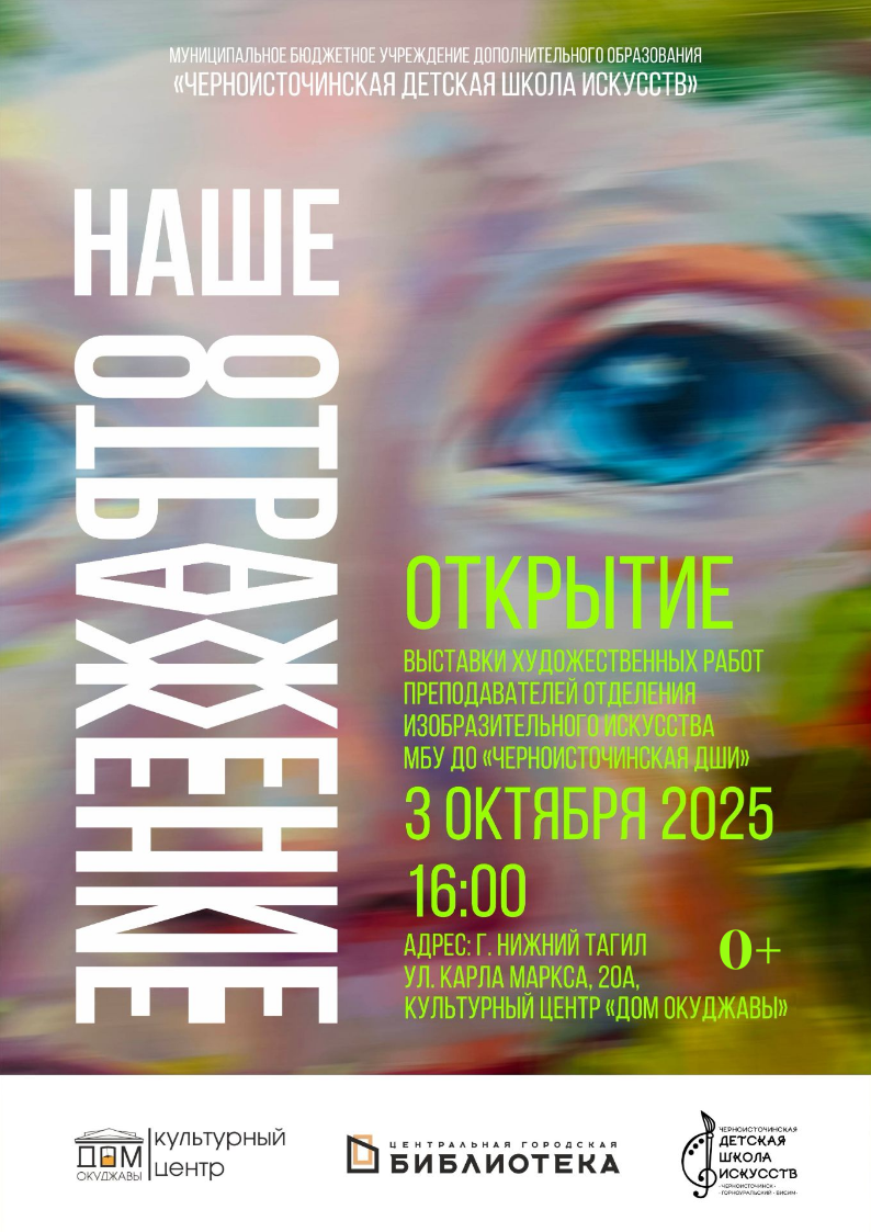 3 октября в 16:00 в культурном центре состоится торжественное открытие выставки «Наше отражение». На ней будут представлены художественные работы преподавателей Черноисточинской детской школы искусств.