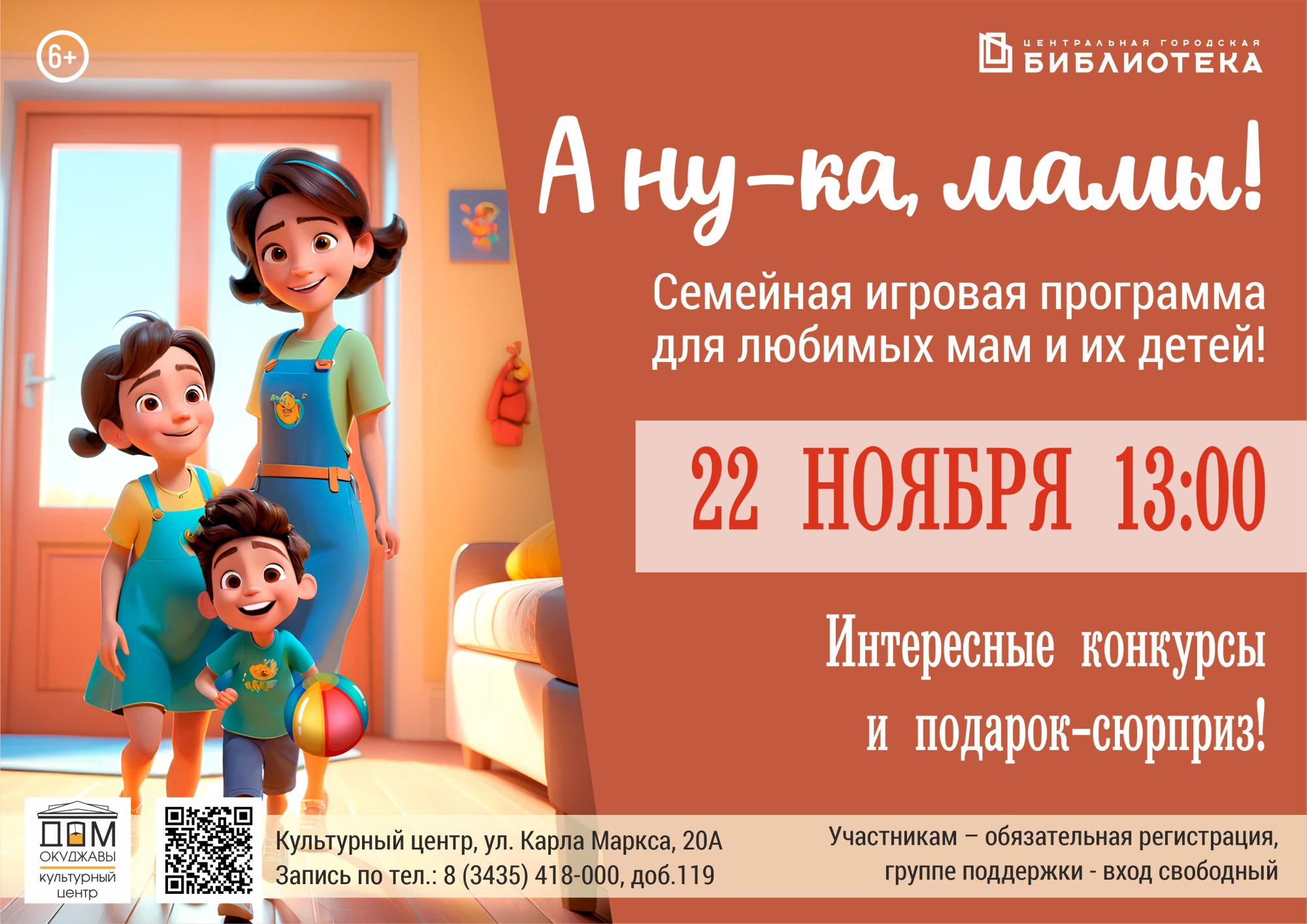 В этом году в культурном центре «Дом Окуджавы» уже восхищались ловкостью дедушек, мудростью бабушек и силой пап. Теперь настало время мам! Семейная игровая программа «А ну-ка, мамы!» состоится 22 ноября в 13:00. Приглашаются все, кто носит самое нежное и гордое звание на свете. Покажите свою заботу, мудрость, кулинарное мастерство и, конечно, безграничную любовь.