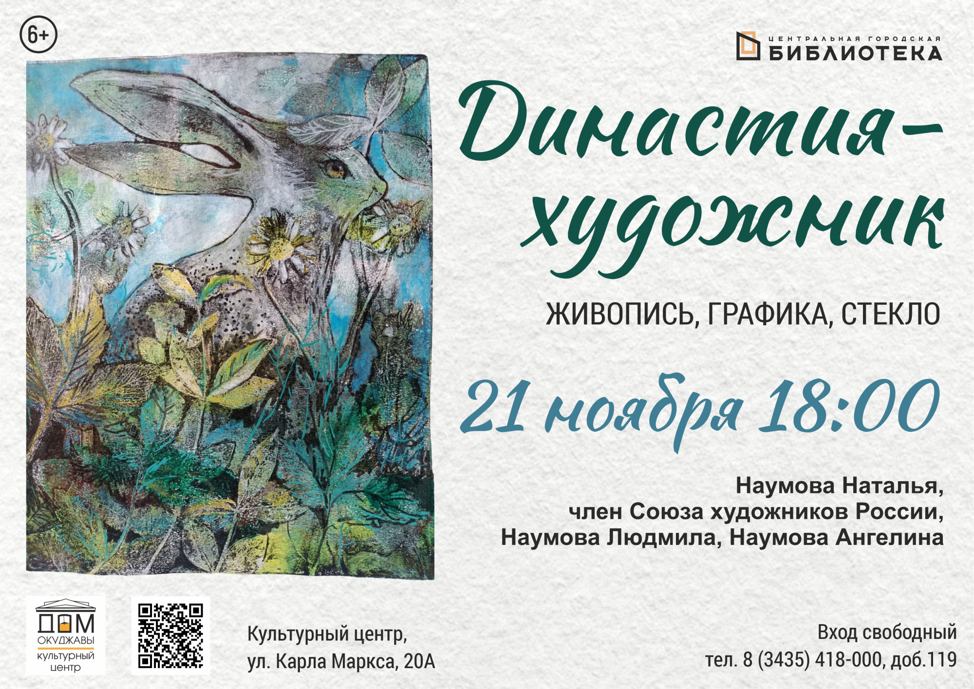 21 ноября в 18:00 в культурном центре «Дом Окуджавы» состоится торжественное открытие выставки «Династия - художник», представляющей творчество трёх поколений семьи Наумовых: мамы, дочери и внучки.