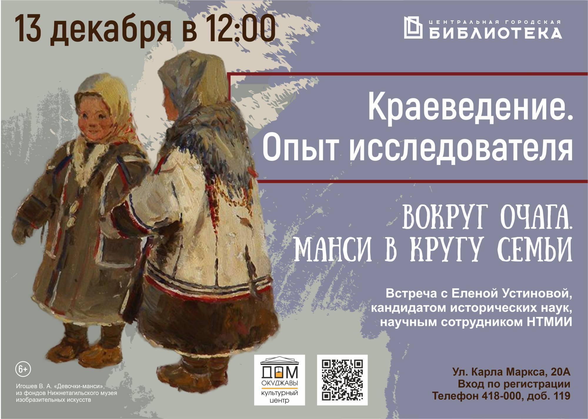 13 декабря в 12:00 культурный центр приглашает на очередную встречу в рамках цикла «Краеведение. Опыт исследователя». Встреча посвящена традициям и мировоззрению народа манси, связанным с жизнью человека. Этот древний уральский народ создал уникальную и целостную культуру.