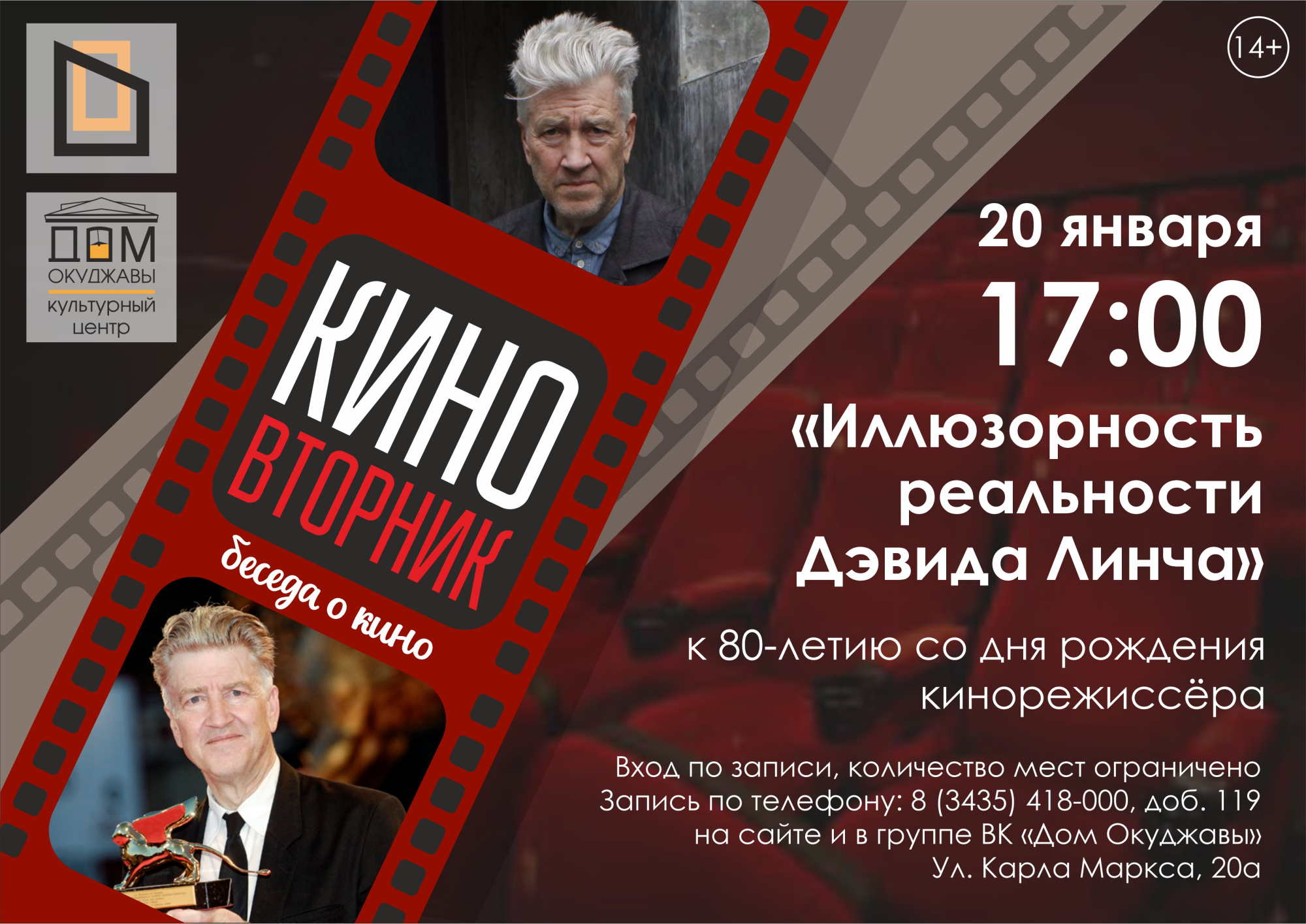 Культурный центр продолжает исследовательский разговор о кино как форме художественного высказывания и способе осмысления реальности. Пятое мероприятие цикла пройдет 20 января в 17:00. Оно посвящено 80-летию со дня рождения Дэвида Линча – одного из ключевых авторов мирового кино конца ХХ – начала ХХI века.