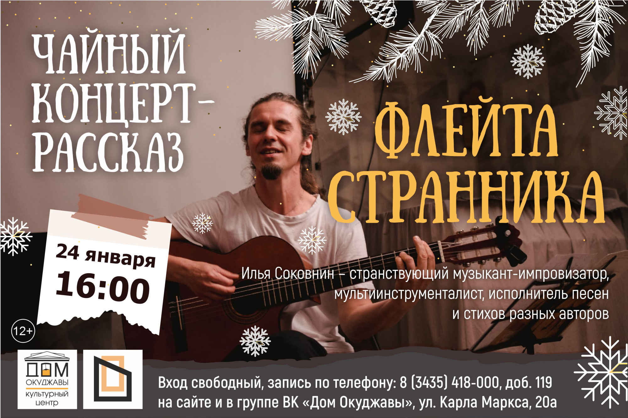 24 января в 16:00 в Культурном центре «Дом Окуджавы» состоится концерт Ильи Соковнина - музыканта и поэта из Кирова. В прошлый раз творческая встреча оставила у слушателей самые теплые впечатления, и теперь он с радостью возвращается в Нижний Тагил с новой программой.