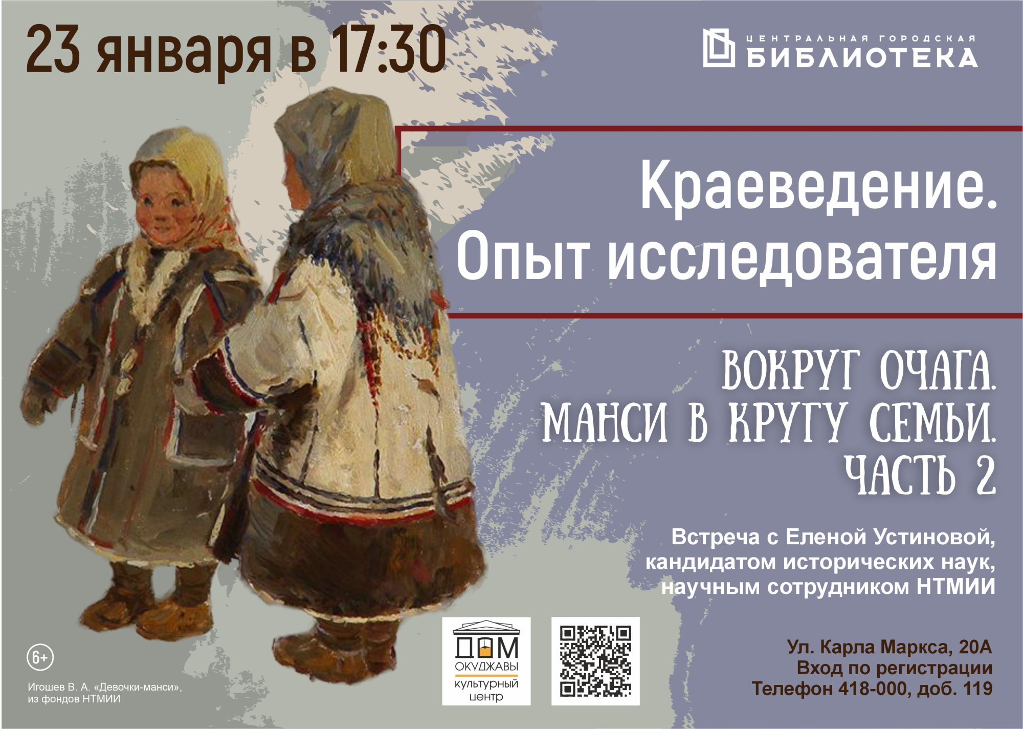 23 января в 17:30 культурный центр приглашает на очередную встречу в рамках цикла «Краеведение. Опыт исследователя». Состоится вторая часть встречи, посвящённая теме «Вокруг очага. Манси в кругу семьи».