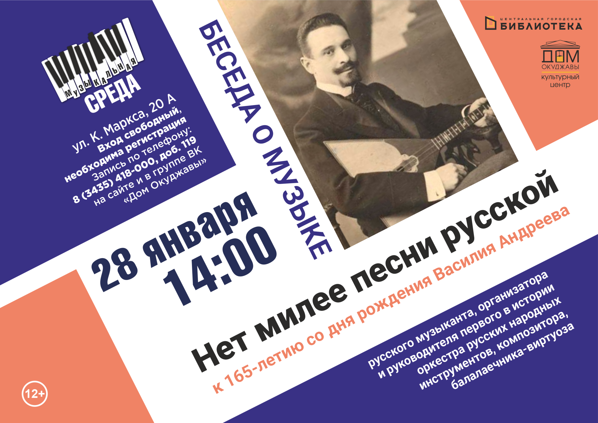 28 января в 14 часов культурный центр приглашает на беседу, посвященную 165‑летию Василия Андреева (1861–1918) – музыканта, композитора, балалаечника‑виртуоза и создателя первого в истории оркестра русских народных инструментов. Вы узнаете, как Андреев превратил балалайку из деревенского инструмента в символ русской музыкальной культуры, реформировал ее конструкцию и основал Великорусский оркестр, который покорил Россию и Европу. Его новаторский репертуар объединил народные мелодии и классические формы, его деятельность вывела русские народные инструменты на мировую сцену.