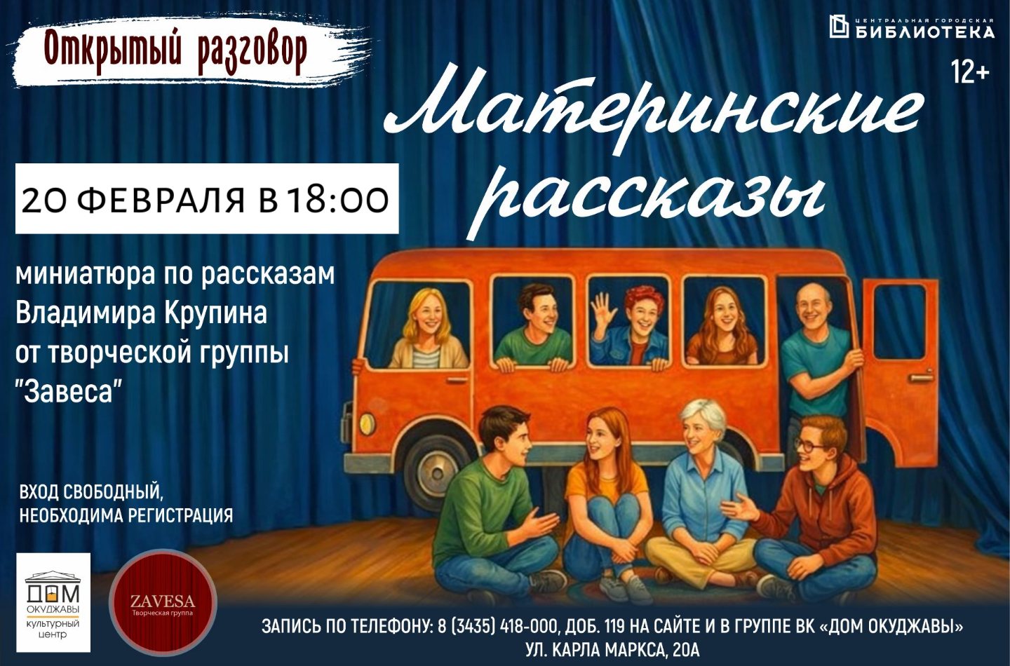 Творческая группа «Завеса» представит театральную миниатюру по рассказам Владимира Крупина «Материнские рассказы». Это глубокий художественный проект, посвященный женщине и Родине.