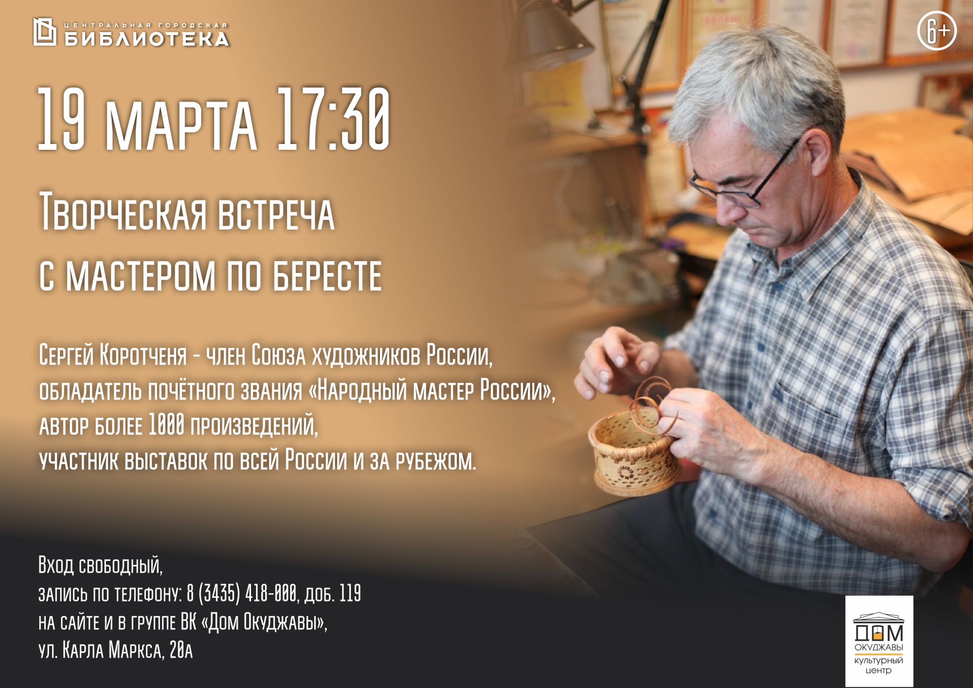 19 марта в 17:30 в культурном центре «Дом Окуджавы» состоится творческая встреча с Сергеем Коротченей, приуроченная к 65-летнему юбилею мастера, имя которого хорошо знакомо ценителям народного искусства далеко за пределами Свердловской области.