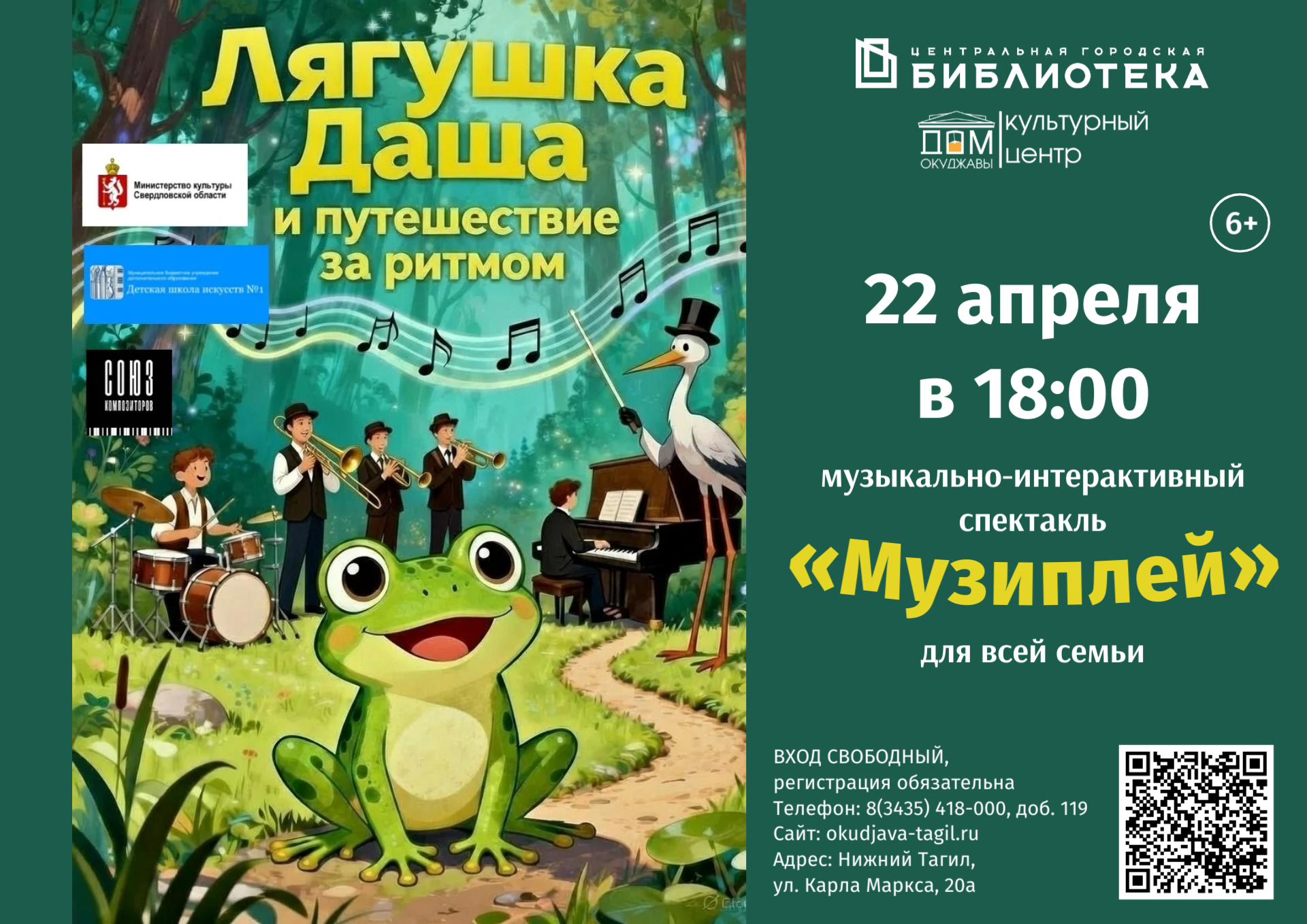 22 апреля в 18:00 культурный центр приглашает на музыкально-интерактивный спектакль «Музиплей» для всей семьи «Лягушка Даша и путешествие за ритмом».